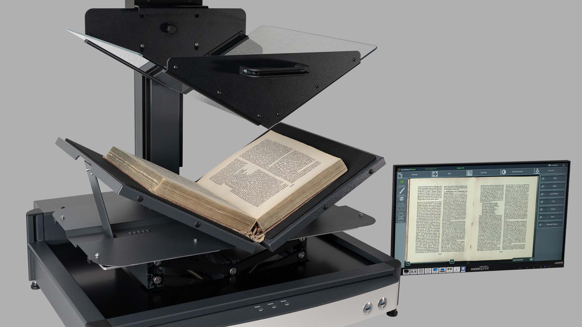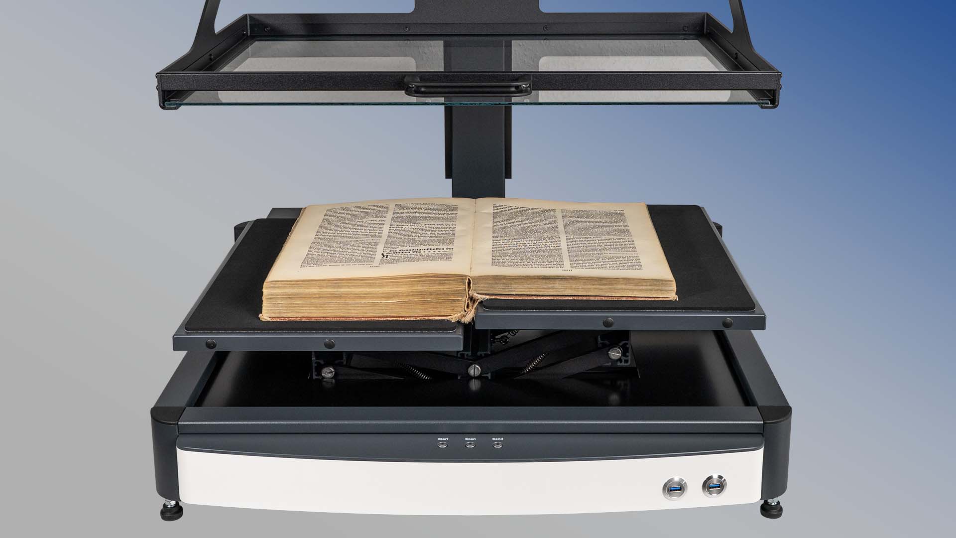 Vielseitiges Scannen von Büchern im Format A3+ mit einer selbstjustierenden Halterung für die Digitalisierung im V-förmigen und flachen Modus.