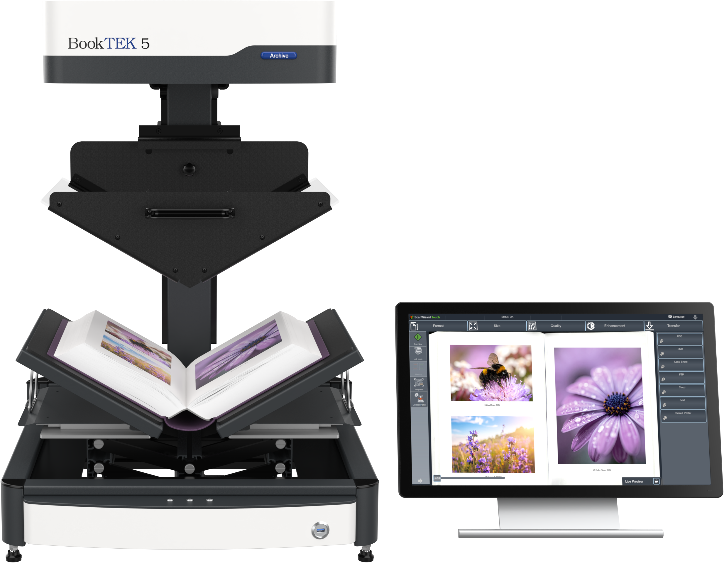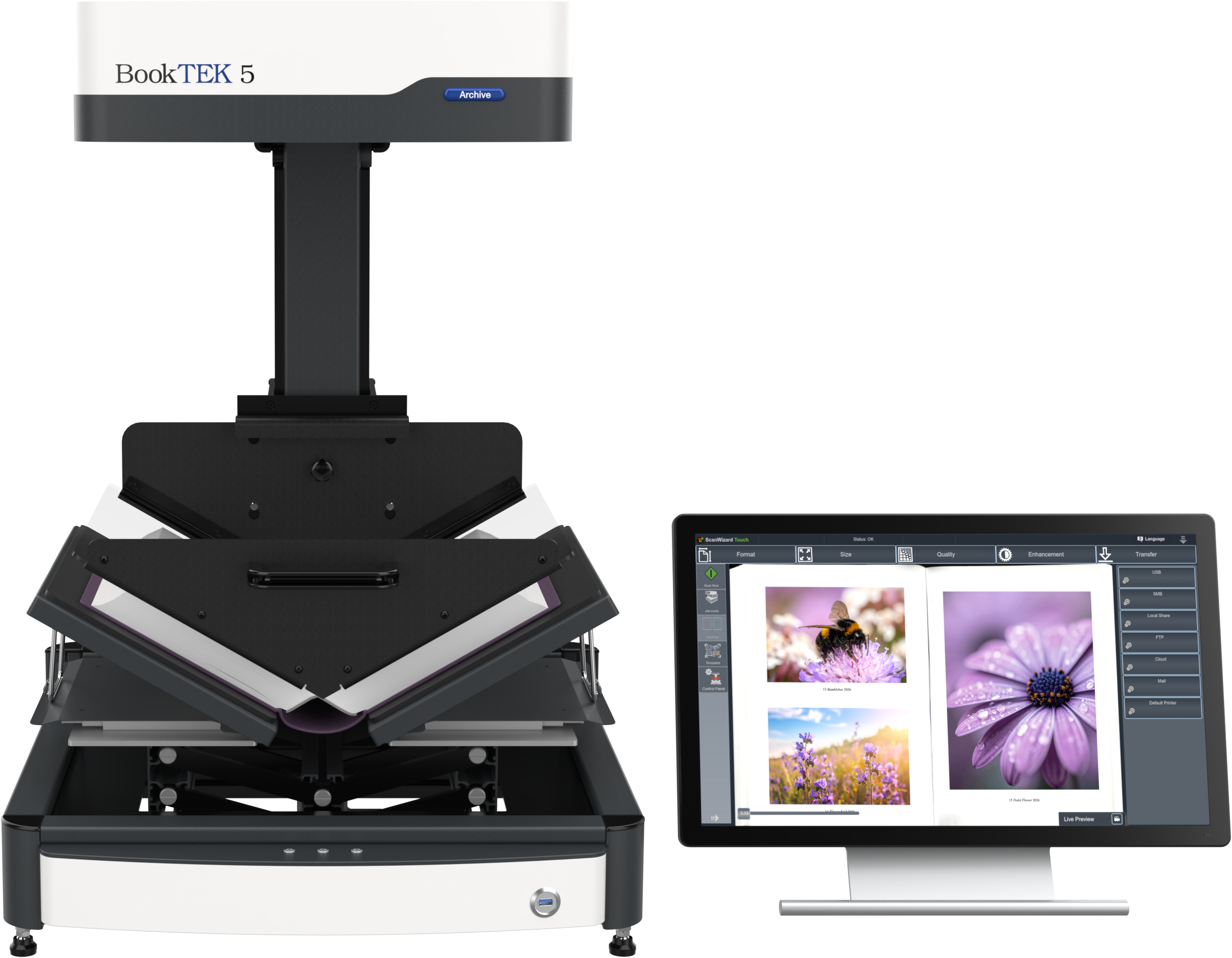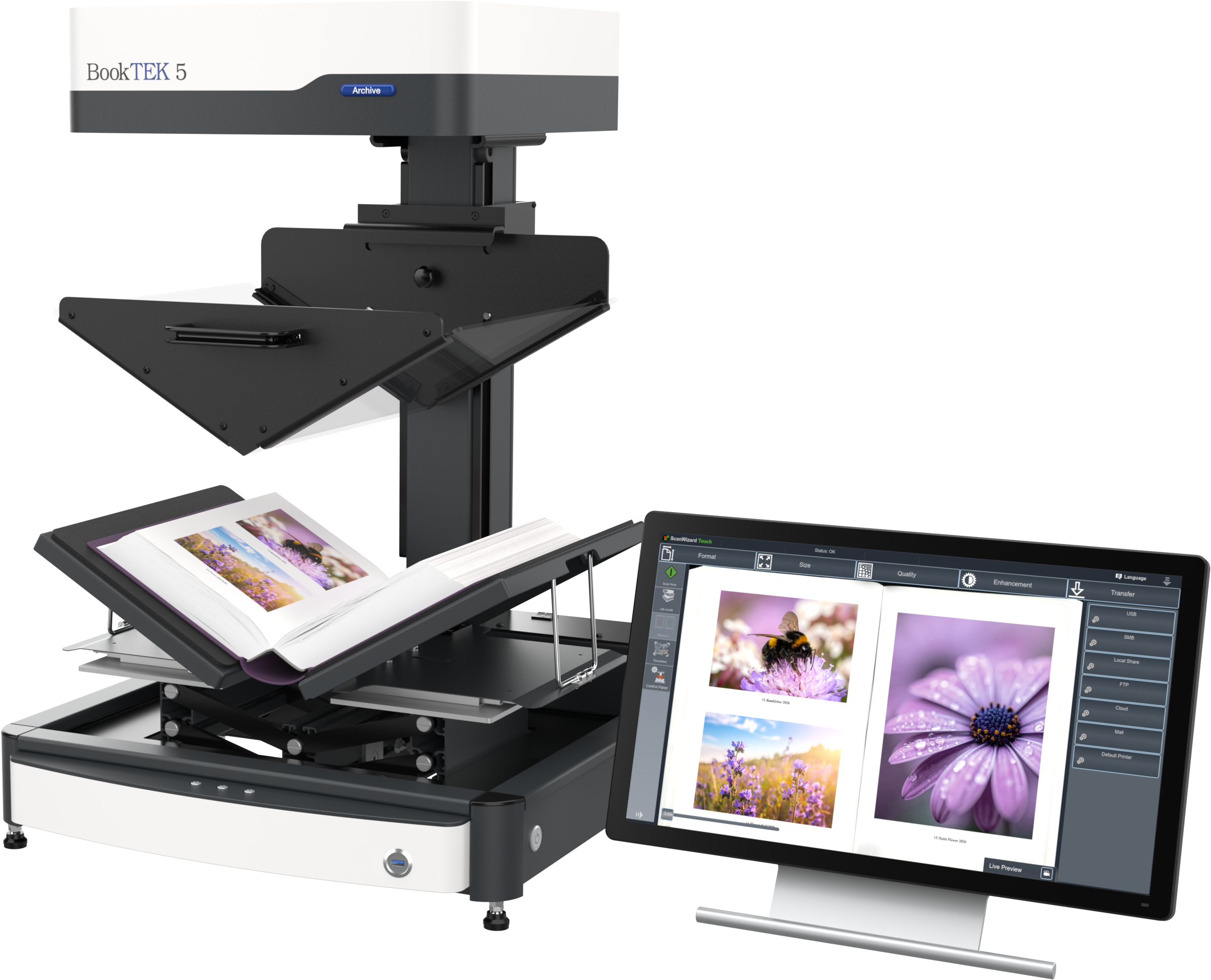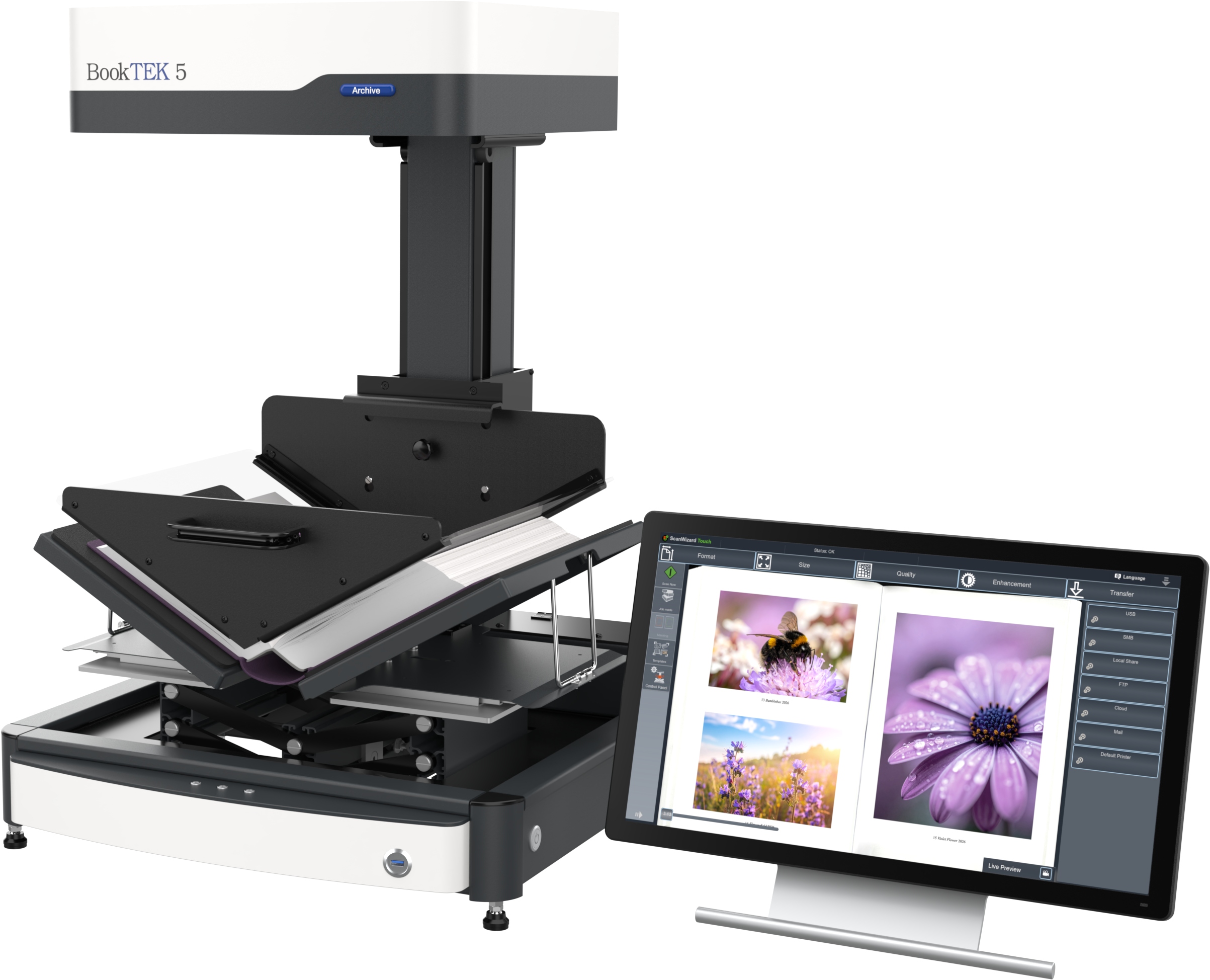The BookTEK 5 V3 Archive is equipped with a 21-inch Full HD multitouch screen for an intuitive user experience. Centrally positioned control buttons ensure a symmetrical and ergonomic operation, making scanning more comfortable and efficient.