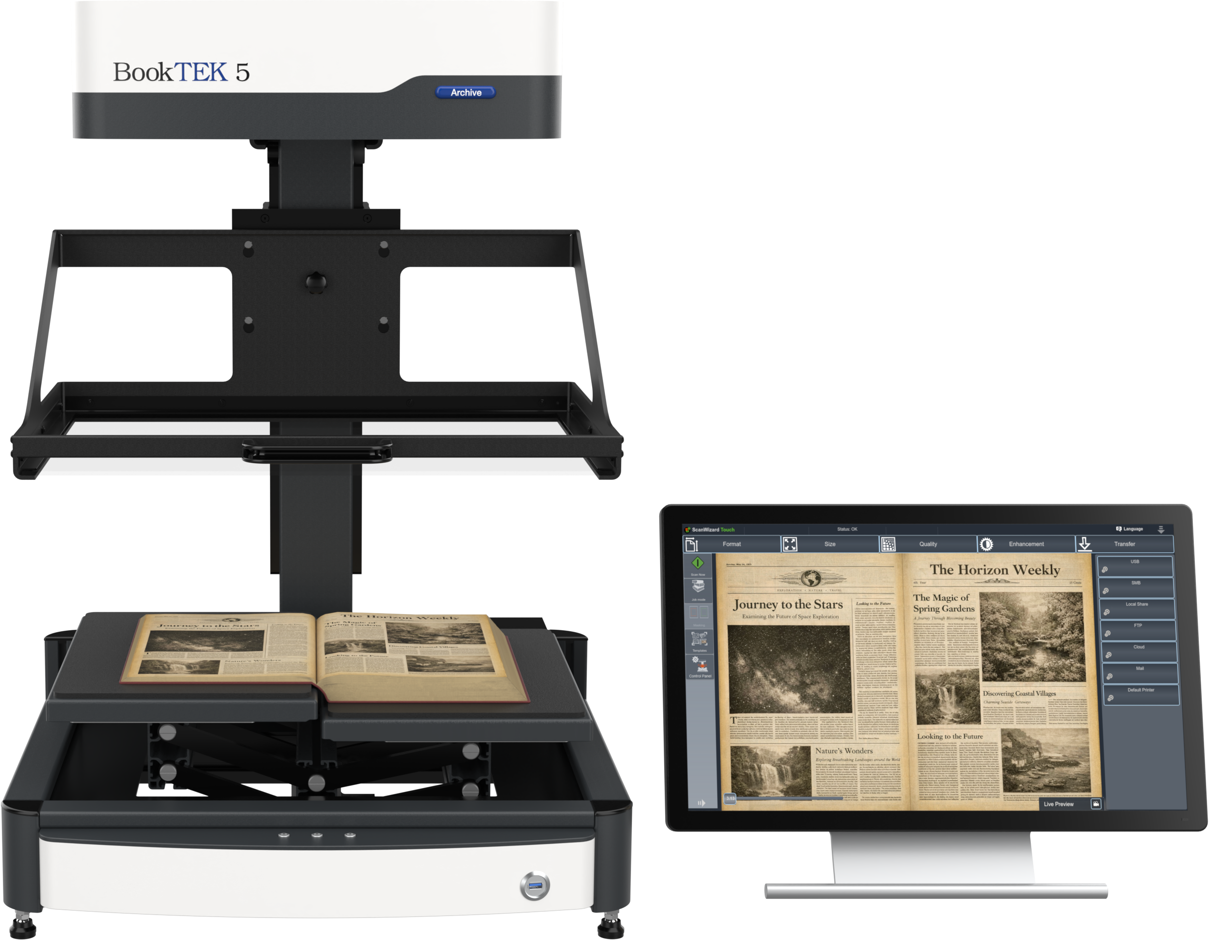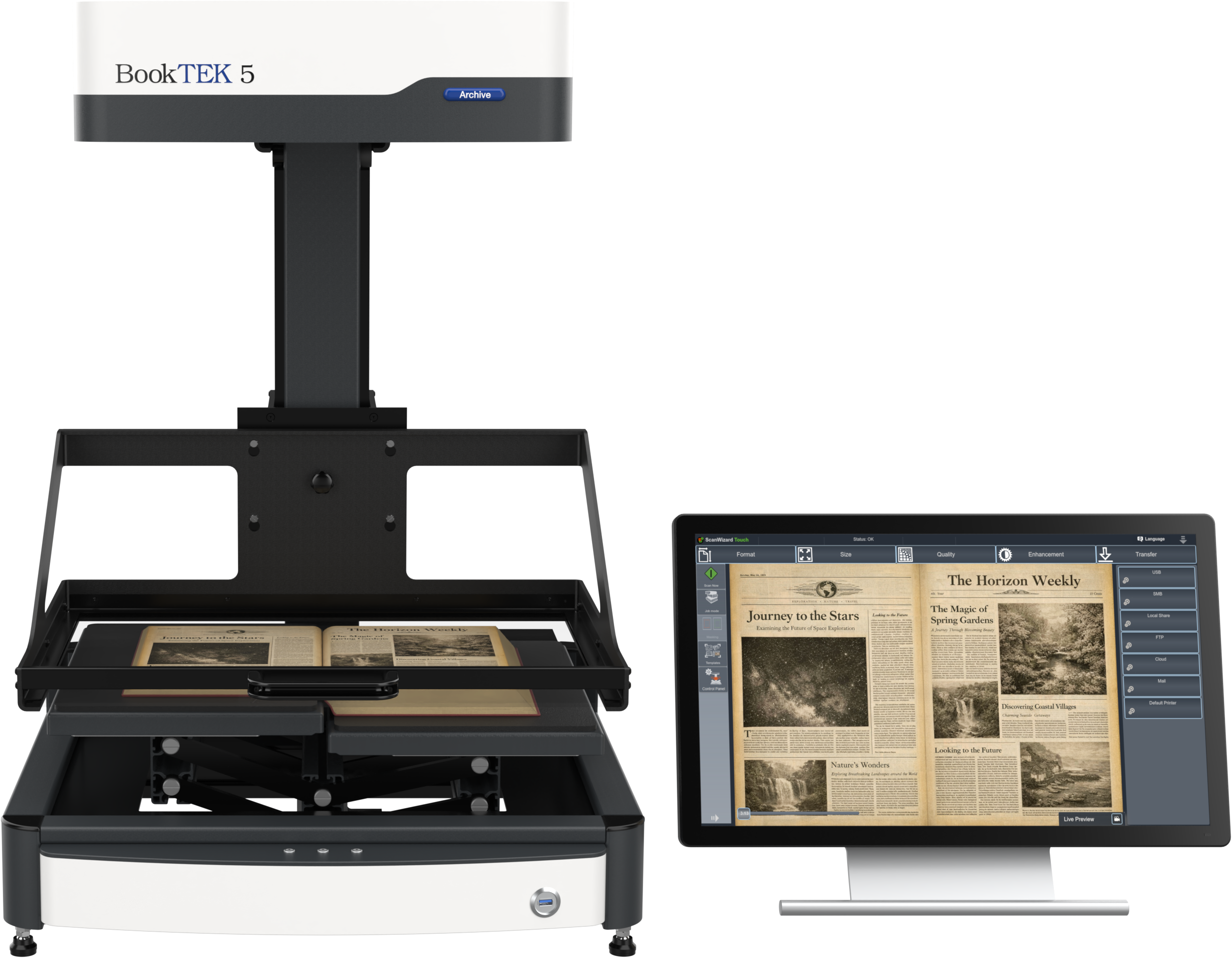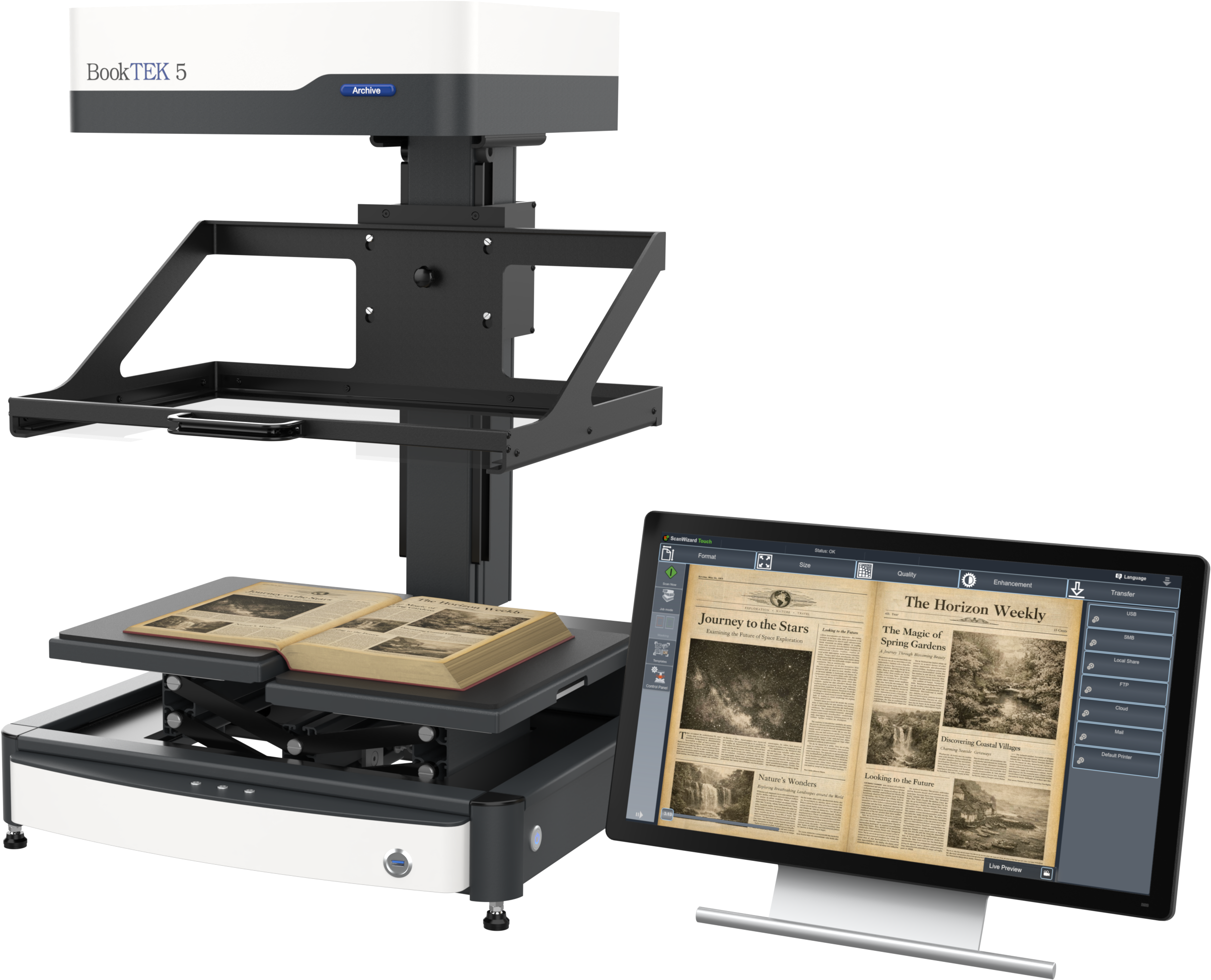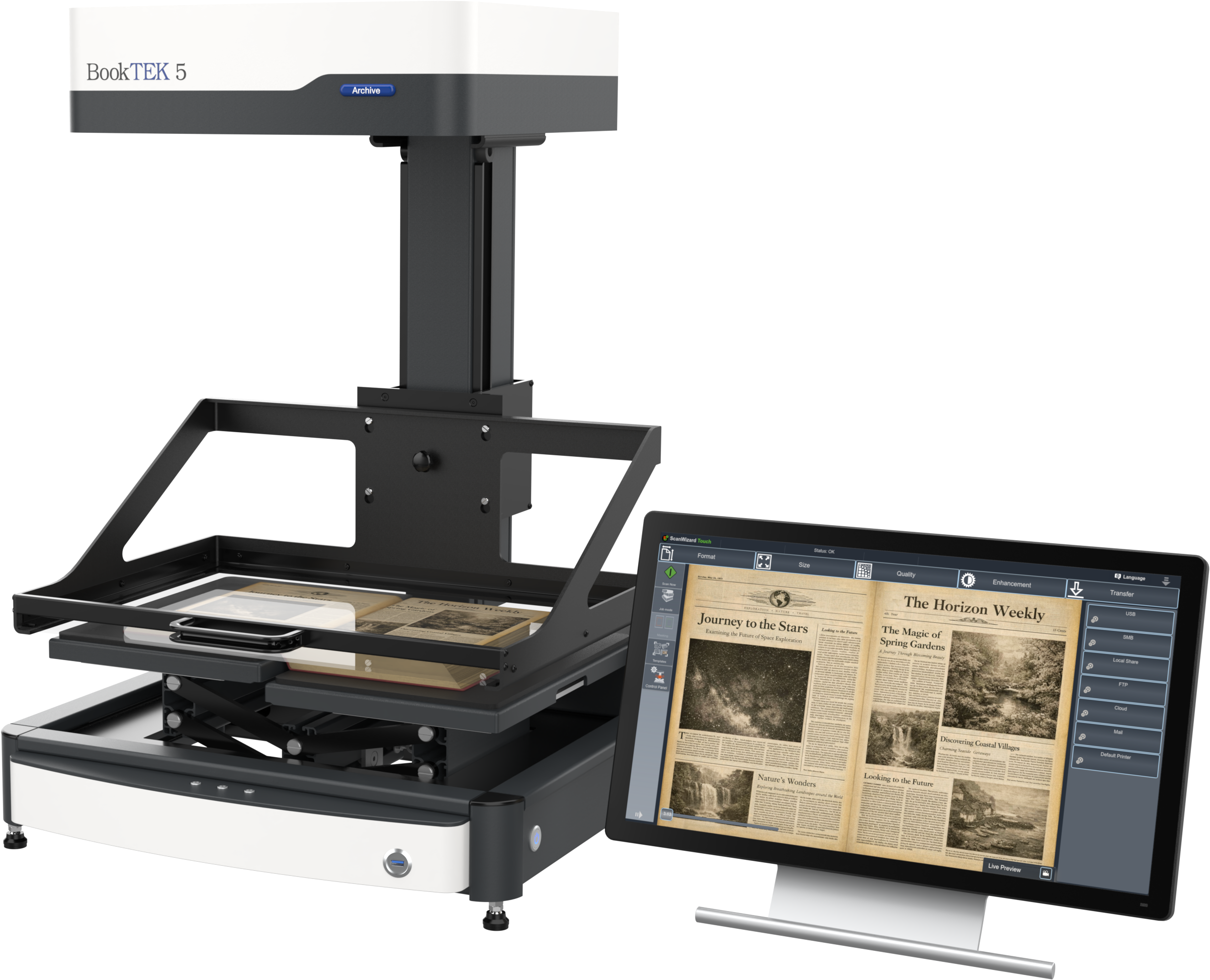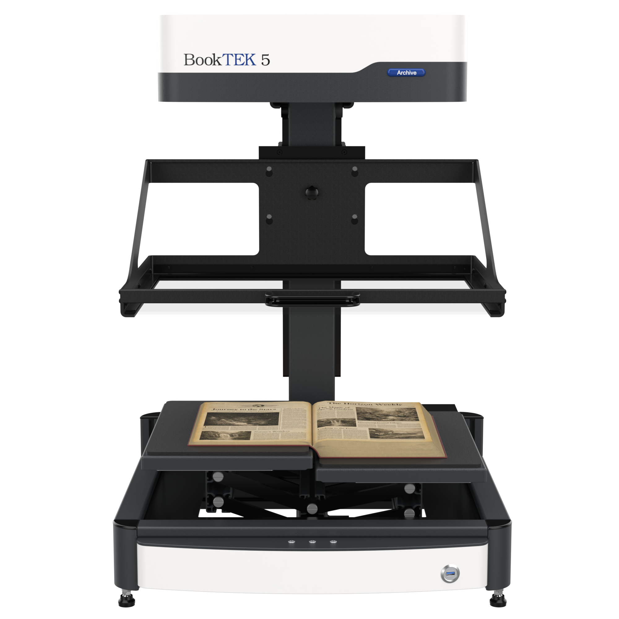 The BookTEK 5 V3 Archive is equipped with a 21-inch Full HD multitouch screen for an intuitive user experience. Centrally positioned control buttons ensure a symmetrical and ergonomic operation, making scanning more comfortable and efficient.